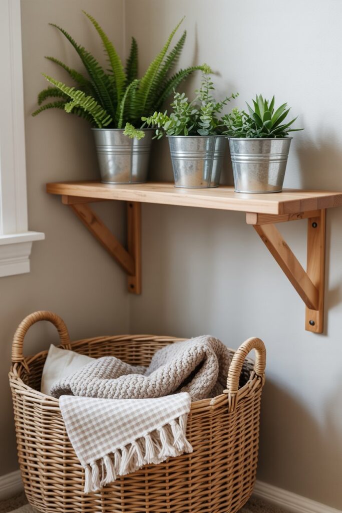 Galvanized metal is a hallmark of farmhouse decor, and incorporating it through planters brings an authentic rustic element into the nursery. Pairing these with vibrant greenery introduces a fresh, natural touch that brightens the space and adds a hint of life. This combination is both practical and charming.