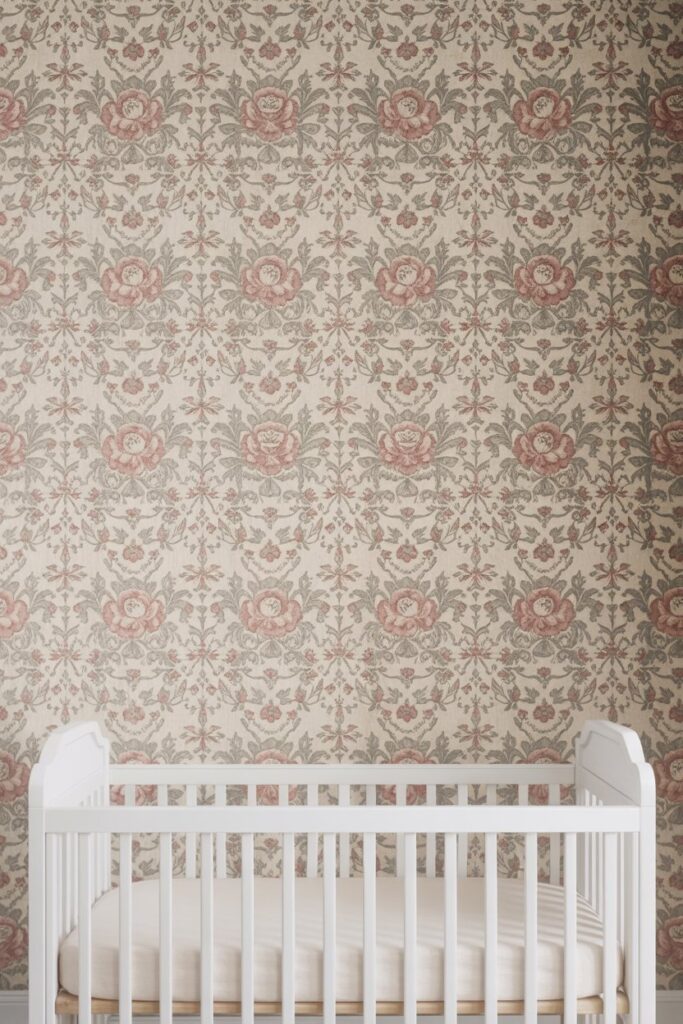 A vintage-inspired floral wallpaper instantly adds a touch of romantic charm and a sophisticated feminine appeal to the nursery. Choosing a pattern with muted tones ensures it blends seamlessly with the modern farmhouse aesthetic rather than clashing. It creates an enchanting and timeless backdrop for your little girl’s room.