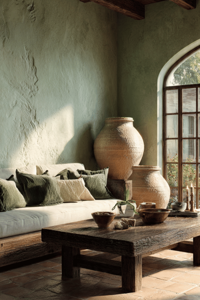 Inspired by the sun-drenched hills of Italy, this pairing brings an earthy, grounded warmth to your home. Sage green walls provide a cooling contrast to the fiery, baked-clay tones of terracotta, creating a living room that feels ancient yet perfectly on-trend for 2026’s shift toward organic materials.
