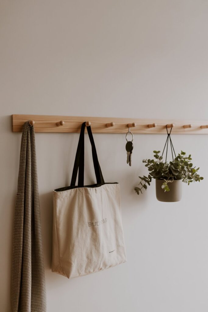 Choose a peg rail in natural wood for warmth or painted white for a seamless, bright look. The beauty lies in its flexibility; you can arrange items as needed, keeping frequently used essentials accessible without creating visual clutter. It’s a simple yet highly effective way to manage everyday items in a stylish, Nordic fashion.